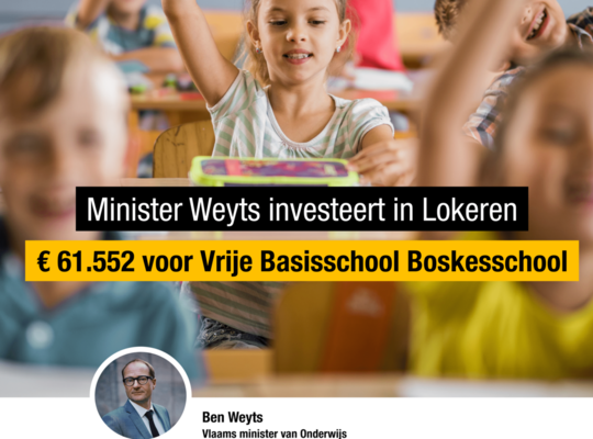 Vlaams minister van Onderwijs Ben Weyts (N-VA) investeert € 61.552 in Vrije Basisschool Boskesschool in Lokeren. “Een investering in scholenbouw is een investering in onze onderwijskwaliteit. En dus in onze eigen toekomst”, zegt Vlaams minister van Onderwijs Ben Weyts.